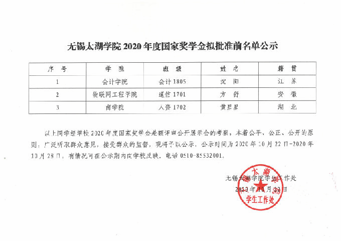 无锡太湖学院2020年度国家奖学金拟批准前名单公示