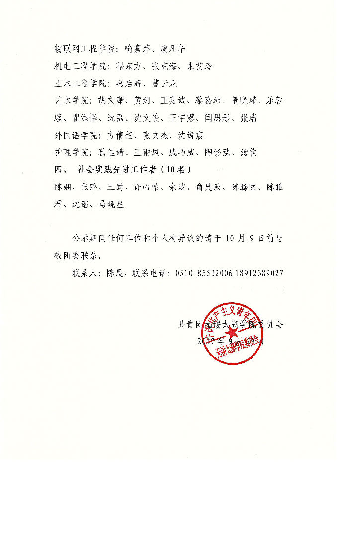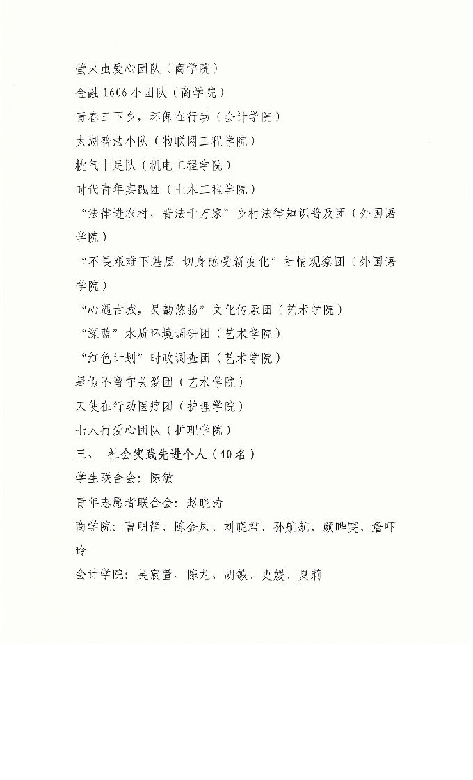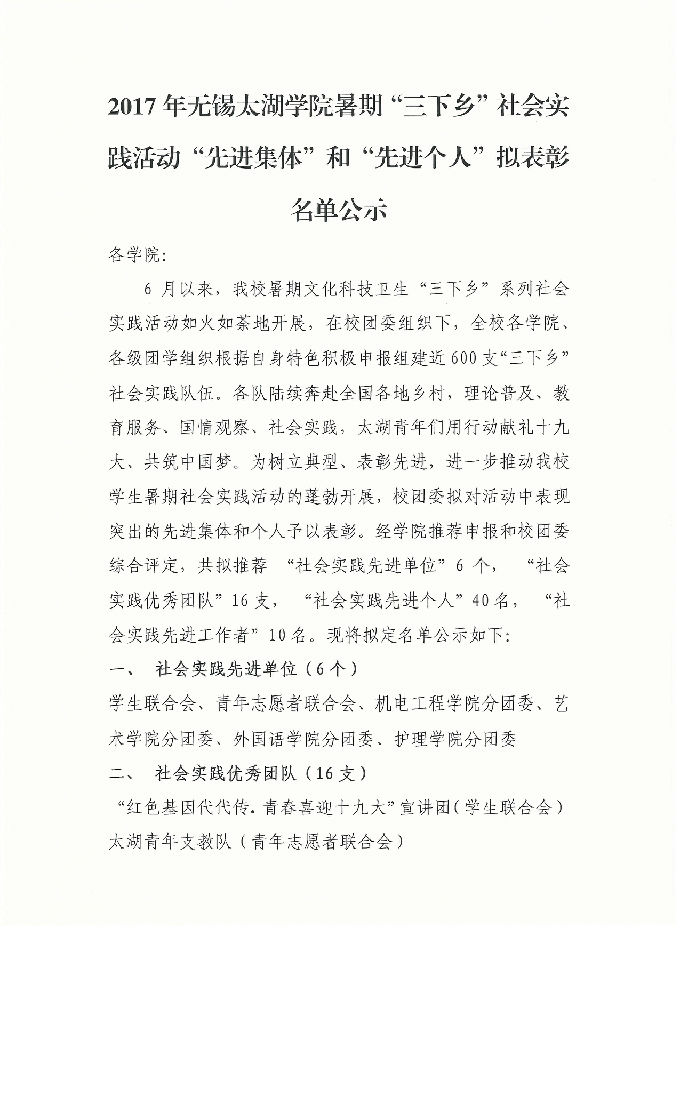 2017年无锡太湖学院暑期“三下乡”社会实践活动“先进集体”和“先进个人”拟表彰名单公示