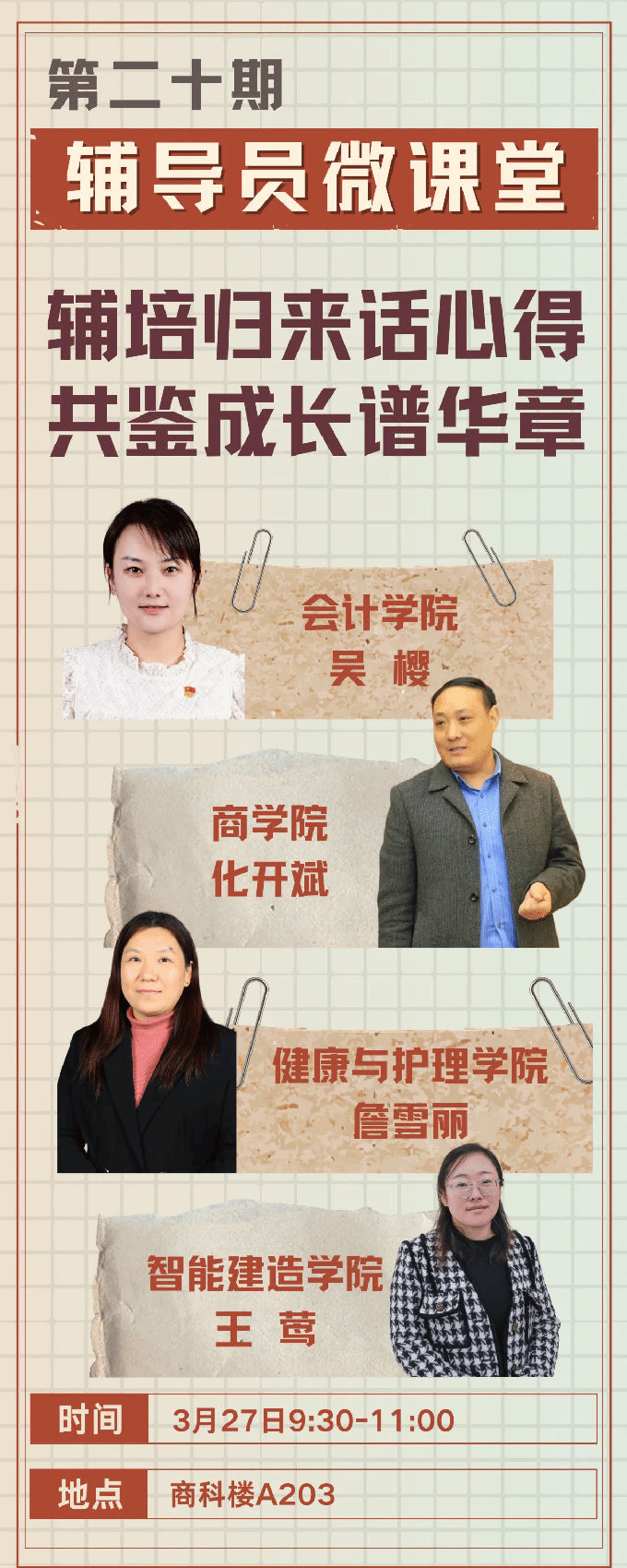 3月27日,我校第二十期辅导员微课堂在商科楼A203教室举行,本期微课堂的主题是“辅培归来话心得,共鉴成长话心得”,智能建造学院辅导员王莺、会计学院辅导员吴樱、健康与护理学院辅导员詹雪丽、商学院辅导员化开斌分享了他们的校外培训心得。来自各学院的12名辅导员参加了本期微课堂。