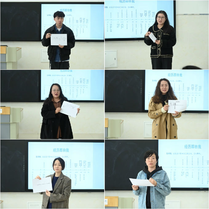 陈利娟老师首先让大家绘制出自己的“生命线”,提出“经历即自我”,通过剖析自己的成长经历,得出符合实际的自我认知。在场辅导员纷纷在白纸上写下了自己的人生经历和职业感悟,苏格兰学院辅导员朱新宇、健康与护理学院辅导员陈春晓、会计学院辅导员许晓艳、艺术学院辅导员周紫琪、物联网工程学院辅导员王奇琦、商学院辅导员焦萍等6名辅导员同大家分享了自己的“生命线”,并讲述了自己对辅导员这一职业的认知和对今后工作的规划。互动结束后,陈利娟老师告诉大家:在指导学生进行职业生涯规划时,可以通过绘制“生命线”这一形式,引导学生重新审视自己的成长历程和职业目标,更好地了解自己的兴趣、性格、能力、价值观,从而理清未来人生发展方向。