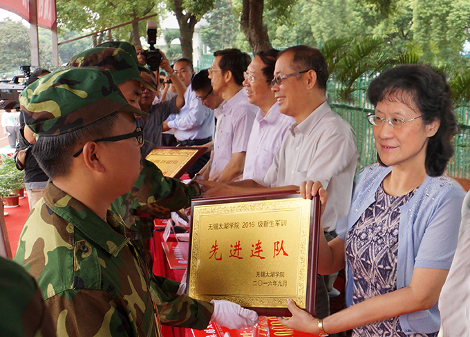 学校党委副书记丁涛宣读《关于表彰2016级新生军训先进集体和先进个人的决定》,对二连、三连、七连、十连,十三连、十五连、十八连、十九连、二十连、二十一连等10个军训先进集体,浦一伟等119名军训优秀标兵予以颁奖表彰。大会还表彰了2016级优秀新生,对超过江苏省本一分数线的钱立涛等一批优秀新生给予每人10000元优秀新生奖学金,对超过江苏省本二分数线的朱慧等一批优秀新生给予每人3000元优秀新生奖学金。喜获万元奖学金的审计1603班陈志敏同学代表全体新生发言,衷心感谢为军训付出辛苦劳动的部队教官们,衷心感谢学校的精心部署和周到安排,以军训这一特殊形式的大课堂,为同学们开启了大学生涯的崭新一页;表示将勇于拼搏,发奋学习,争做太湖学院的优秀学子。