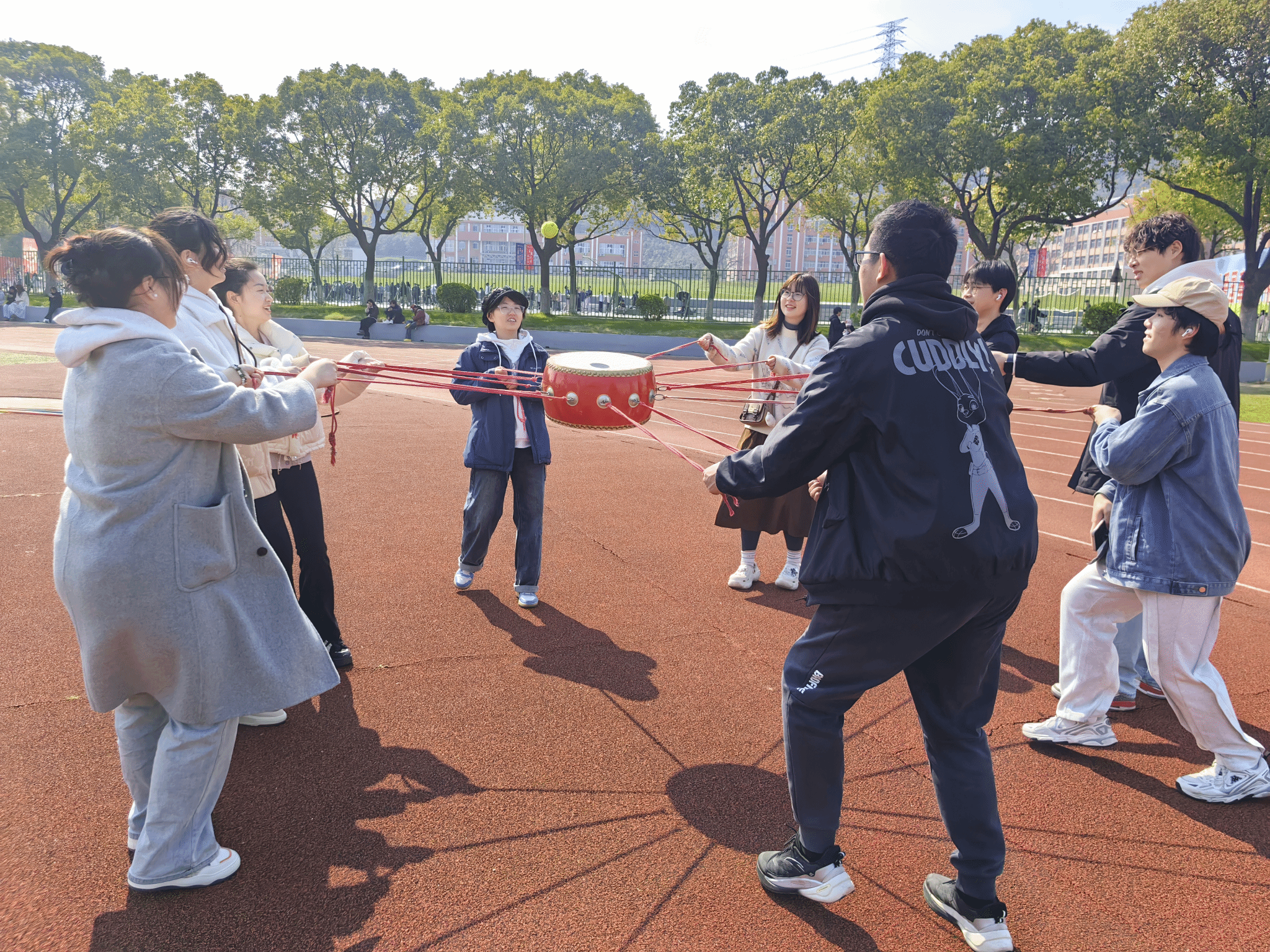 在“同心鼓击球”项目环节,同学们以鼓为心、分散围站,十余道红绳自鼓身向四周舒展。同学们第一次接触,指尖的力道尚带着生涩的试探,浅黄皮球首次抛落,鼓面震颤的节奏与众人的发力频率尚未咬合,球身或斜擦绳间,跳出鼓面。但随着一声“慢一点、看鼓面!”此后每一次鼓与球的轻触,都伴着脚步的微调、眼神的示意。初时的节奏错落、脚步错杂,终在一次次调整与磨合中化为默契的同频共振。