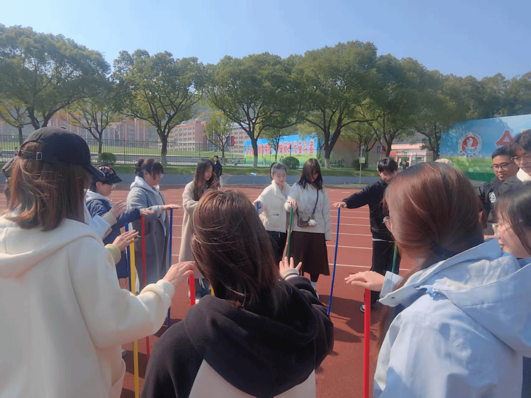接着,在“趣味接力杆”环节中,同学们手持缤纷彩杆围成环形阵列。指令响起,彩杆在掌心间有序流转,众人迅速以眼神校准节奏、调整站位,全力保障环节顺畅推进。过程中虽有部分同学出现衔接失误,但大家并未慌乱,而是迅速相互提醒、及时补位,在短暂调整后便重新恢复节奏。每一次杆身的平稳交替,既是团队肢体默契的直观体现,更彰显了班级成员“包容互助、协同共进”的协作精神,为活动增添了务实而温暖的集体底色。