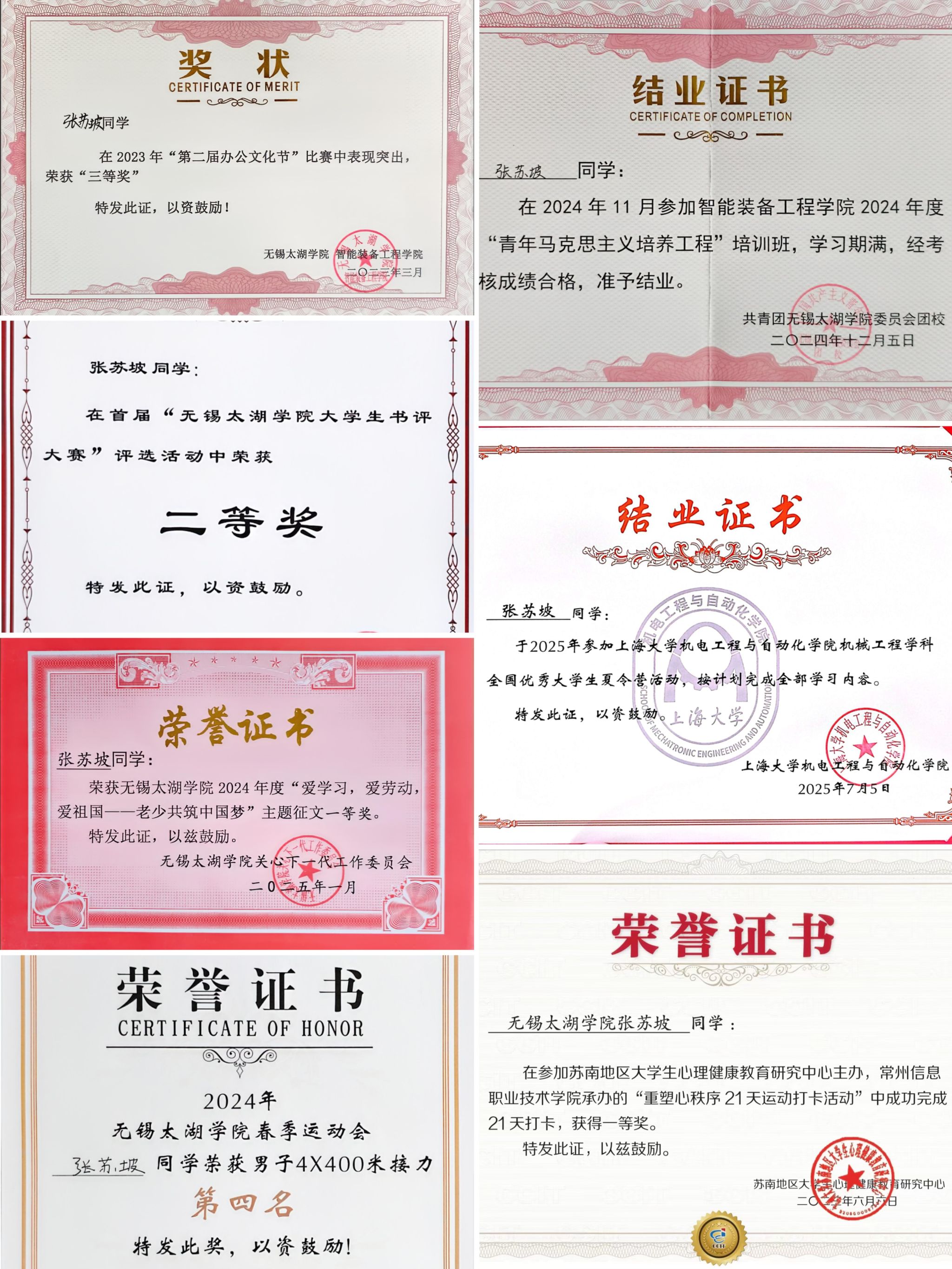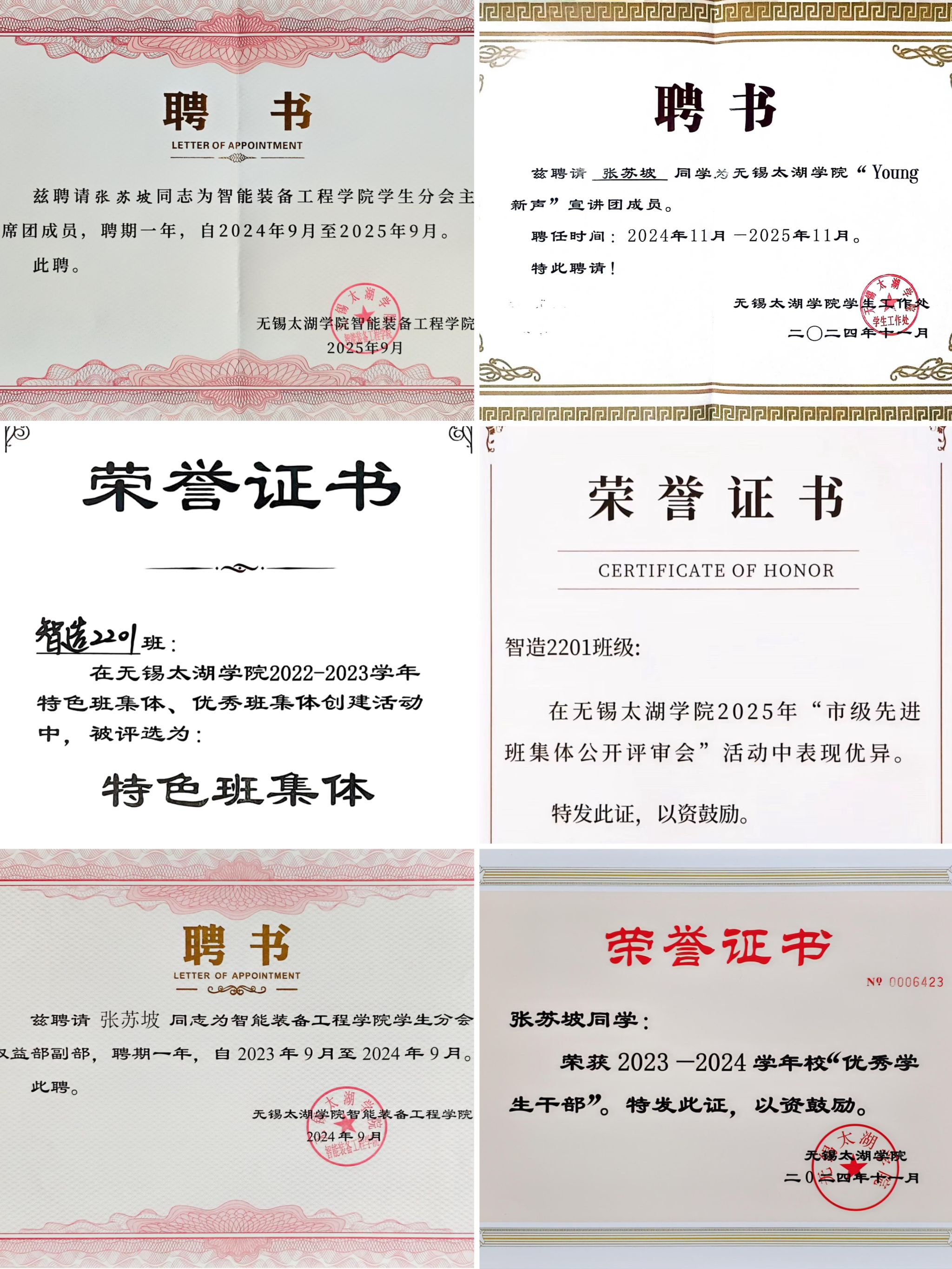 担任职务:智造2201学习委员、智能装备工程学院学生分会主席、无锡太湖学院第一届“Young新声”优秀学子宣讲团成员
