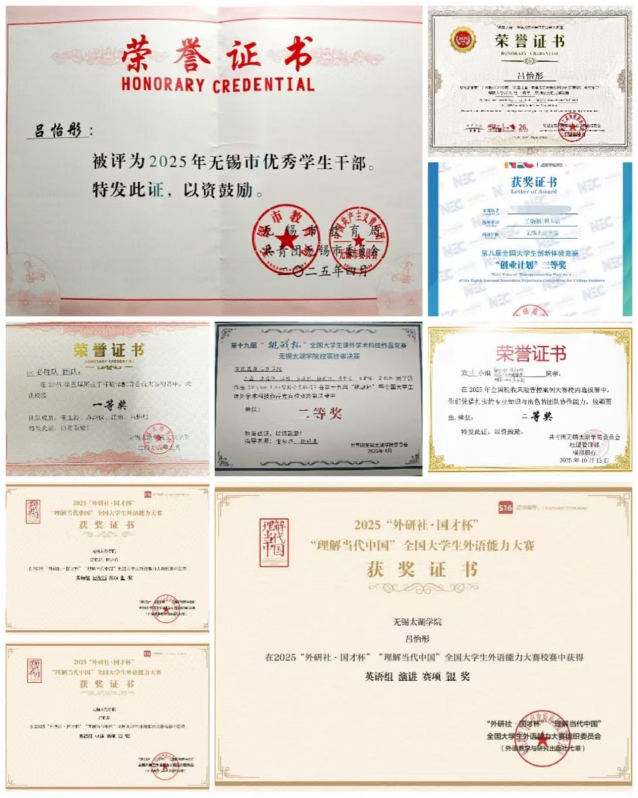 2025年5月获全国大学生创新体验竞赛国家三等奖;2023年10月获“一带一路”全国大学生英语阅读大赛全国三等奖;2025年4月获希望之星风采大赛江苏省特等奖;2025年6月获“挑战杯”大学生课外学术科技作品竞赛省二等奖;2024年6月获第十届“LSCAT”杯江苏省笔译大赛优胜奖;2024年5月获全国大学生英语竞赛省二等奖;2025年3月获苏州市团委青创桥全市第七名;2024年9月获外研社全国大学生外语大赛口译校二等奖;2023年10月获外研社全国大学生外语大赛写作校二等奖;2024年6月获词达人杯全国大学生英语词汇能力大赛校二等奖;2025年10月获外研社全国大学生外语大赛短视频校二等奖;2025年10月获外研社全国大学生外语大赛演讲校二等奖;2025年10月获外研社全国大学生外语大赛口译校二等奖;2024年10月获第九届“科云杯”全国大学生财会职业能力大赛校三等奖; 2024年11月获校一等奖学金;2024年11月获校优秀学生干部;2025年4月获无锡市优秀学生干部;2024年10月获第四届“阿拉丁杯”翻译配音比赛校二等奖;2025年5月获第五届阿拉丁杯翻译配音大赛校一等奖;2024年12月获大学生职业生涯规划大赛校三等奖;2025年9月获税收风险管控案例大赛校二等奖;2025年9月获第八届外教社杯跨文化能力大赛短视频校二等奖;